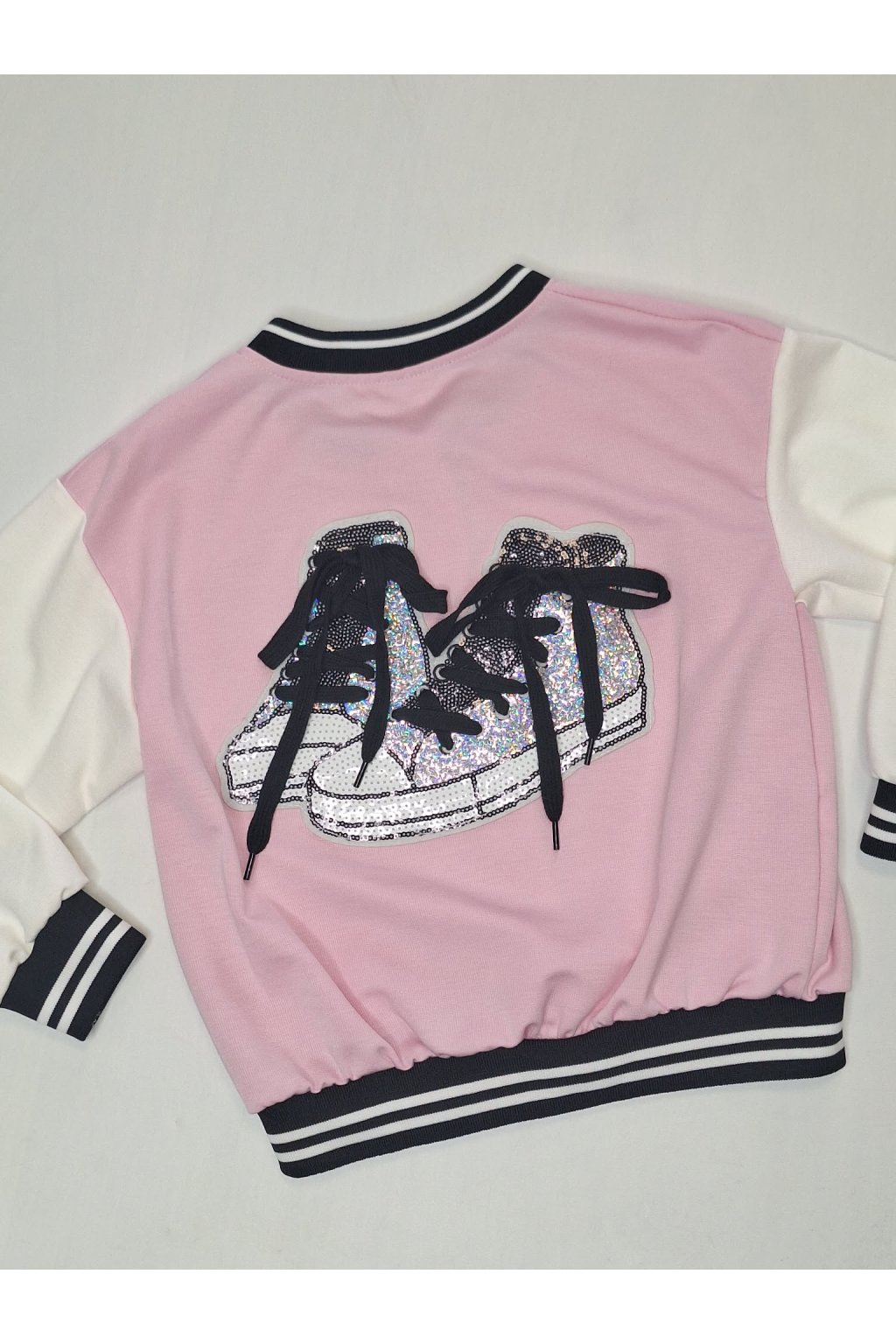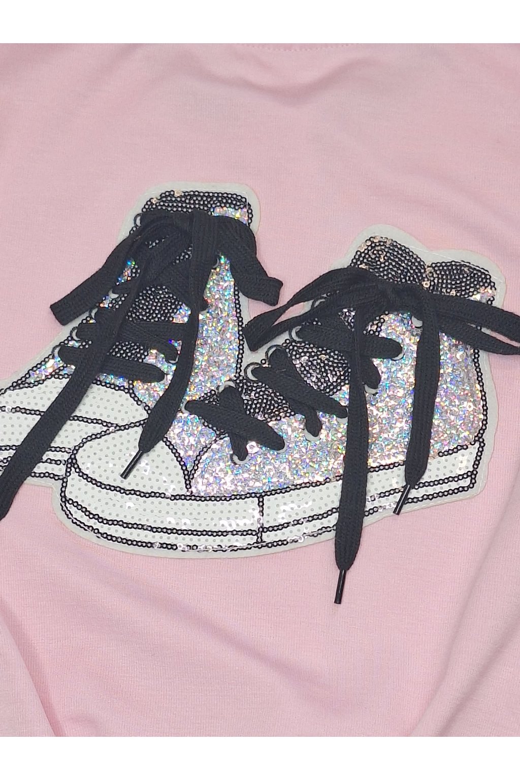 Vzadu veľká výšivka topánok so skutočnými šnúrkami a jemnými flitrami.