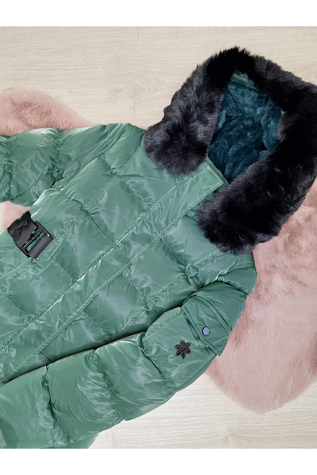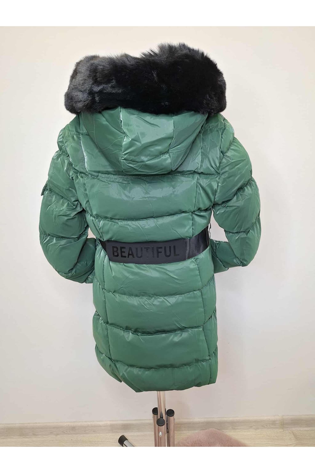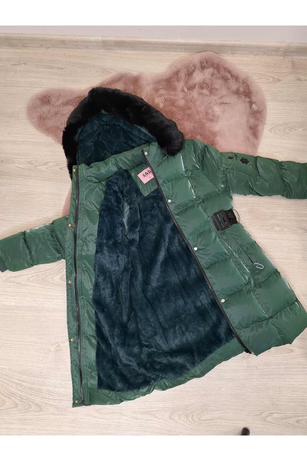 Nádherná zimná bunda pre dievčatá v netradičnej krásnej tmavo zelenej farbe .