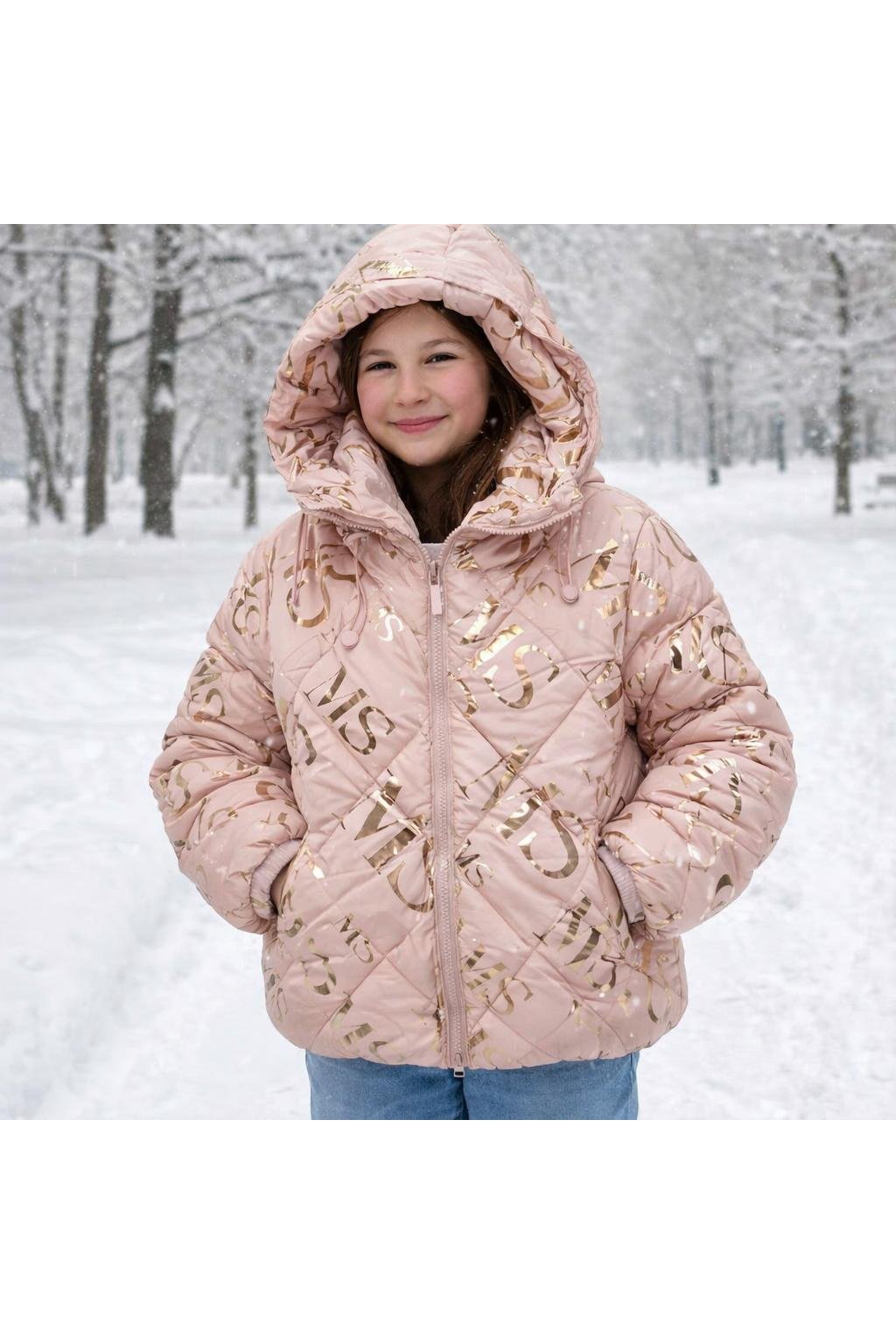 Zimná dievčenská bunda so zlatými nápismi .