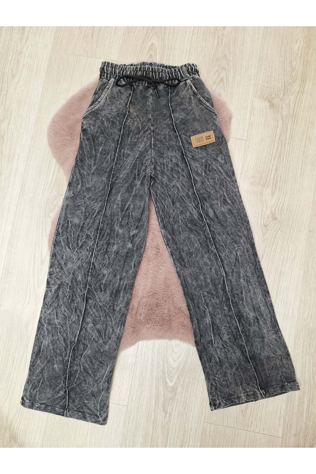 Pohodlné dievčenské tmavo sivé nohavice - široký strih nohavíc.