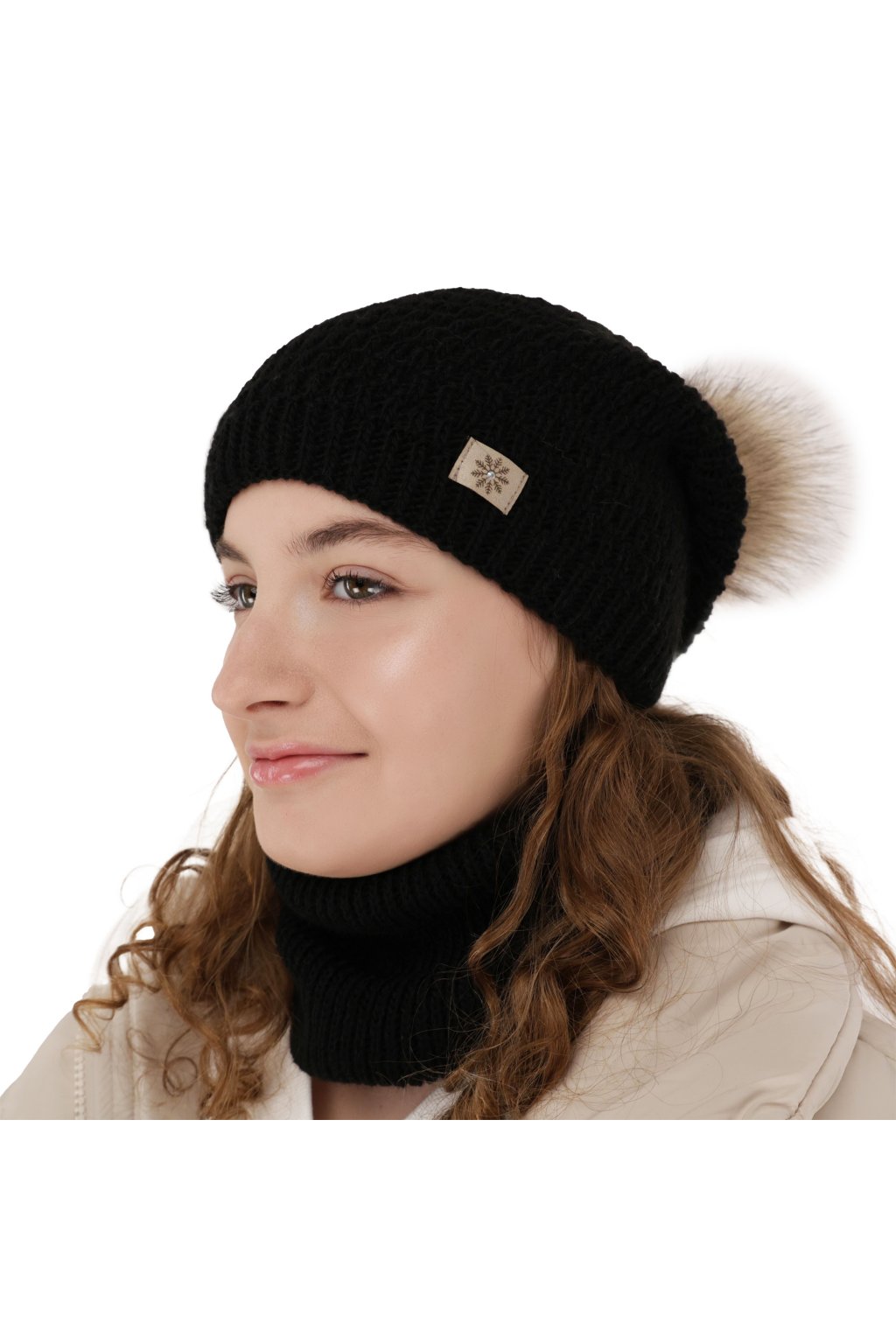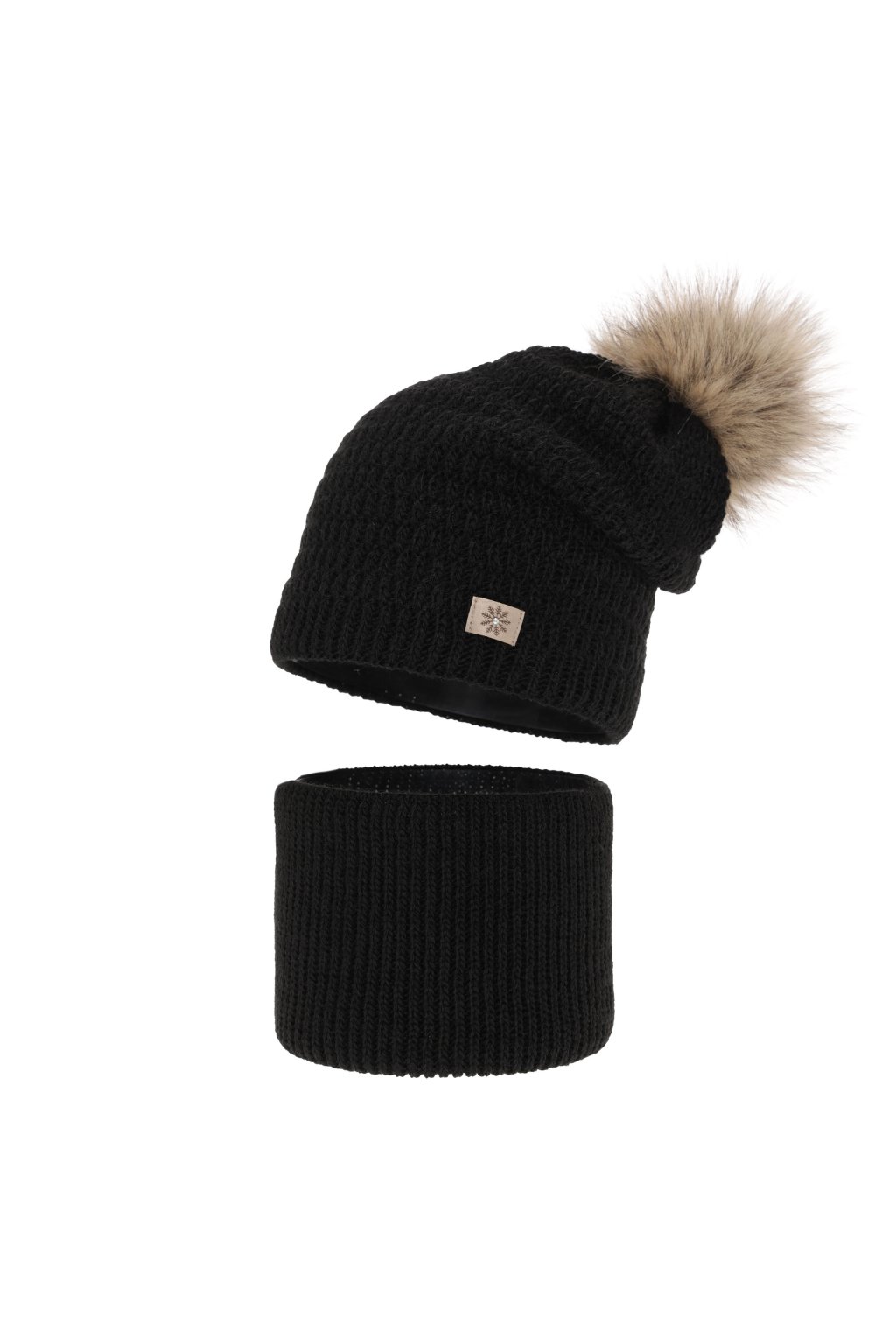Čiapka zateplená fleesom s veľkým brmbolcom z umelej kožušiny .