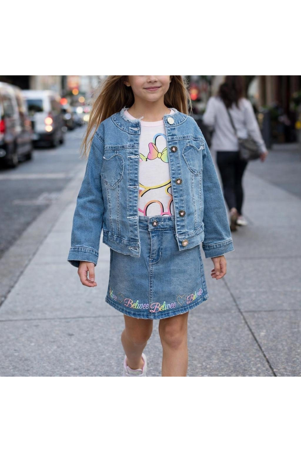 Komplet obsahuje rifľovú bundu s krásnymi gombíkmi , tričko a bundička s rovnakou potlačou .