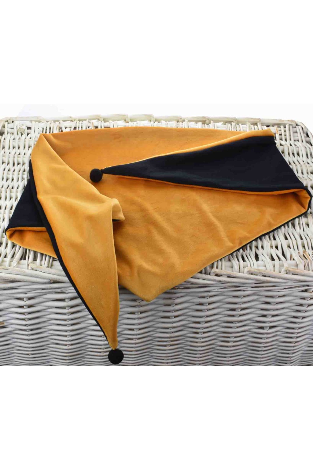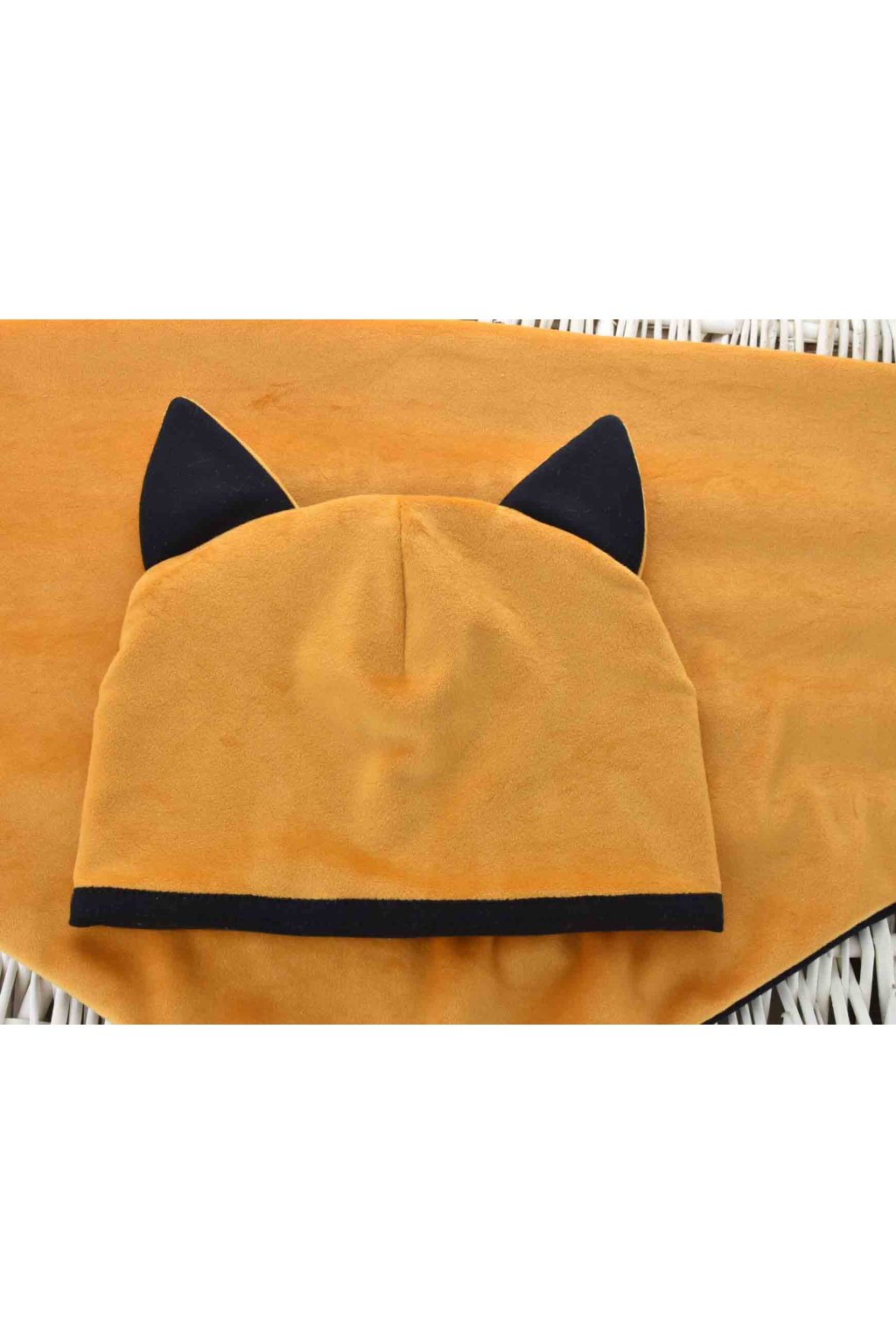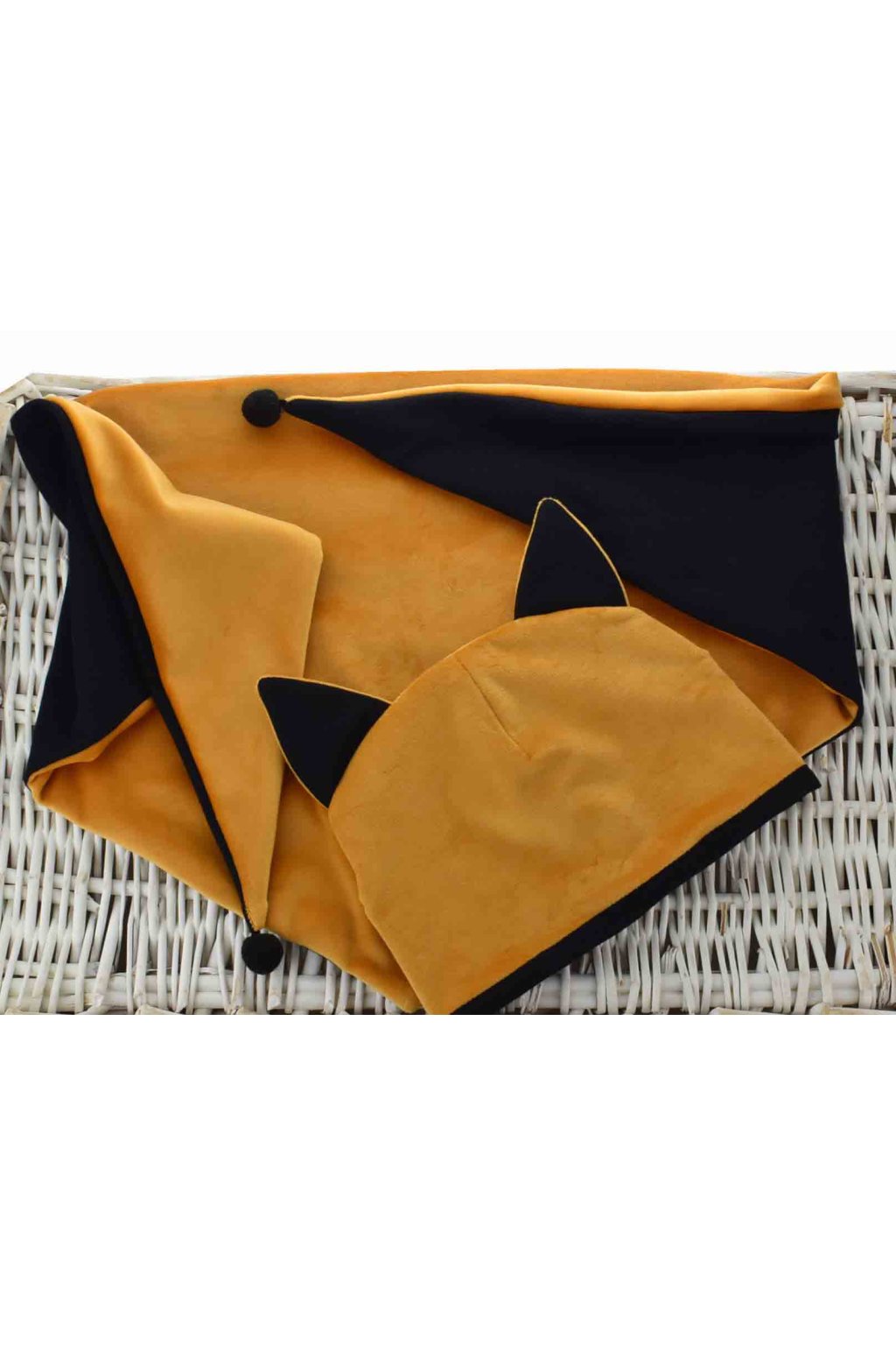 Dievčenský velúrový komplet čiapka s ušami a šatka horčicová
